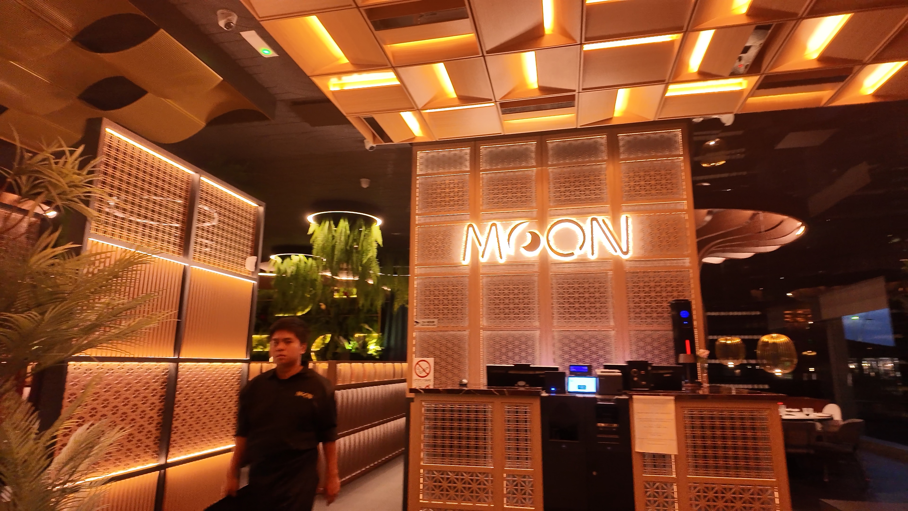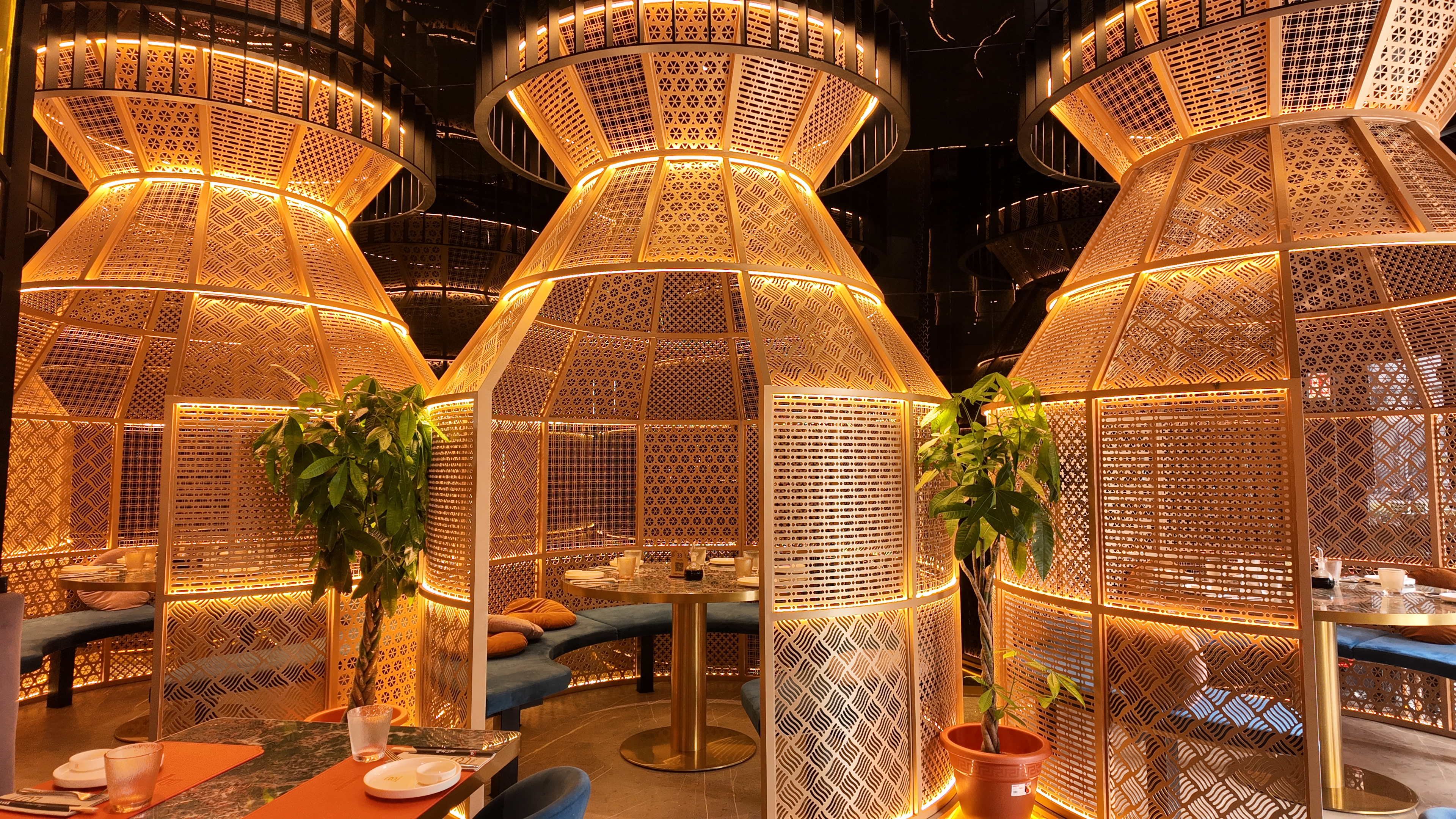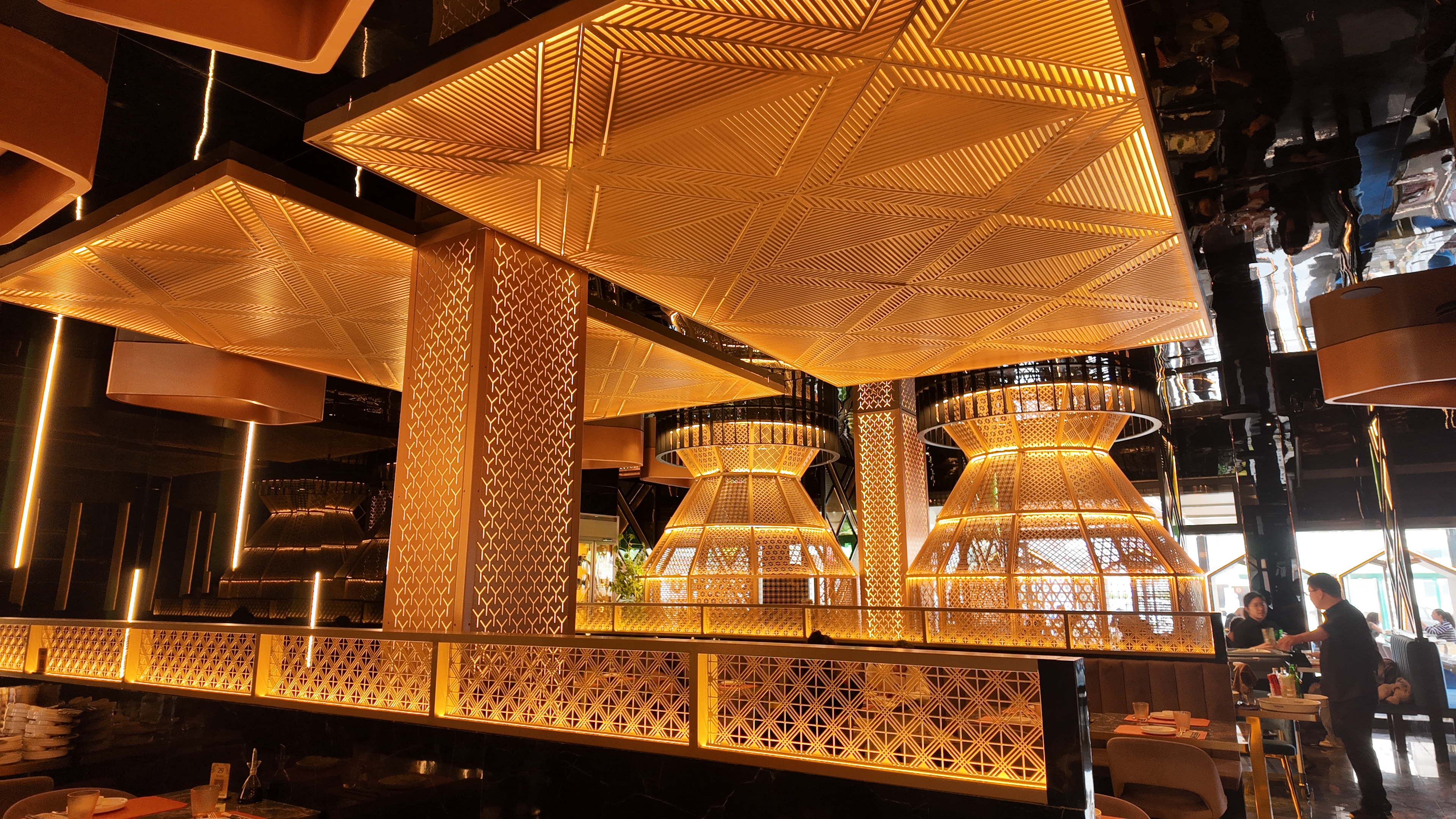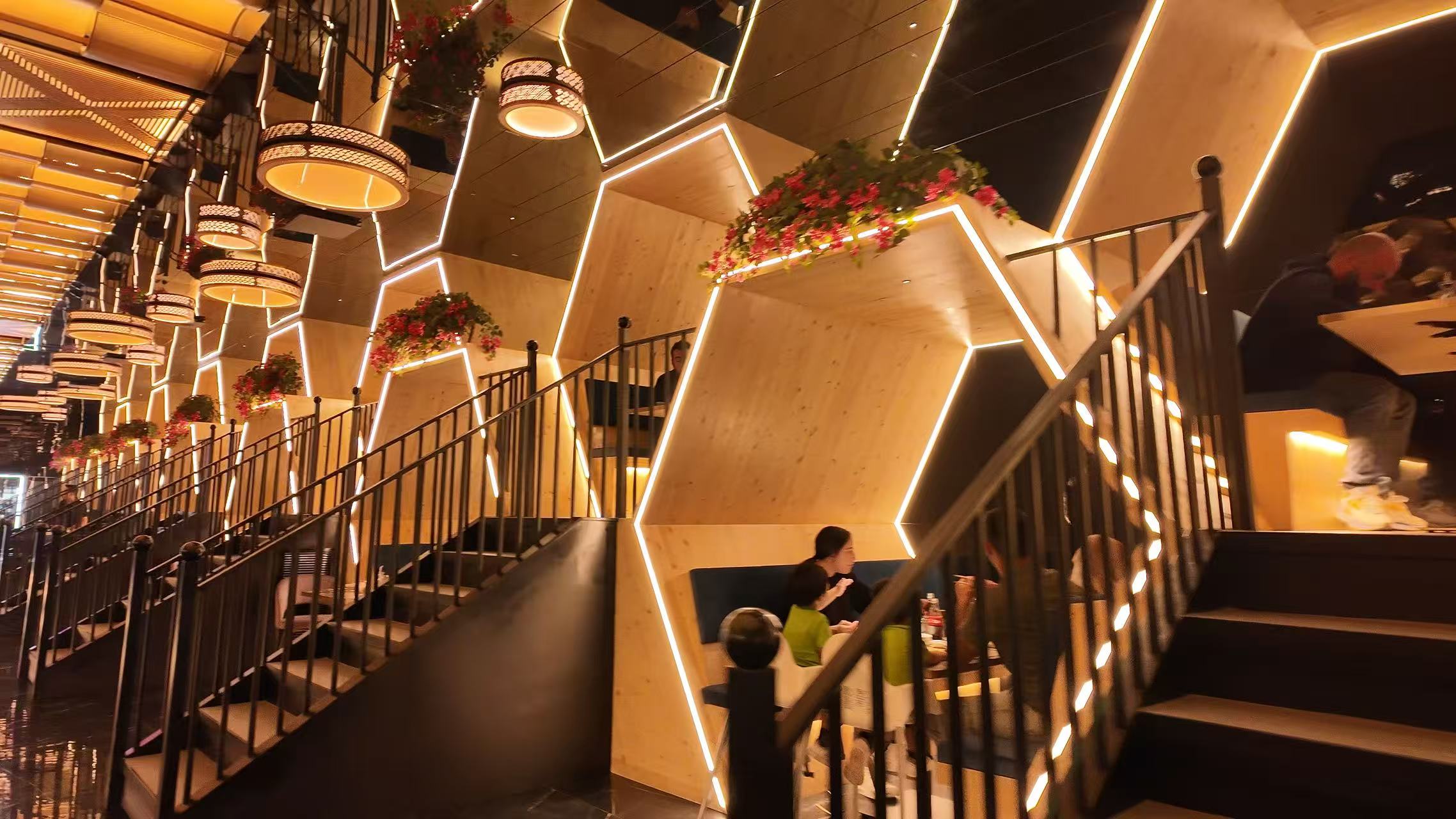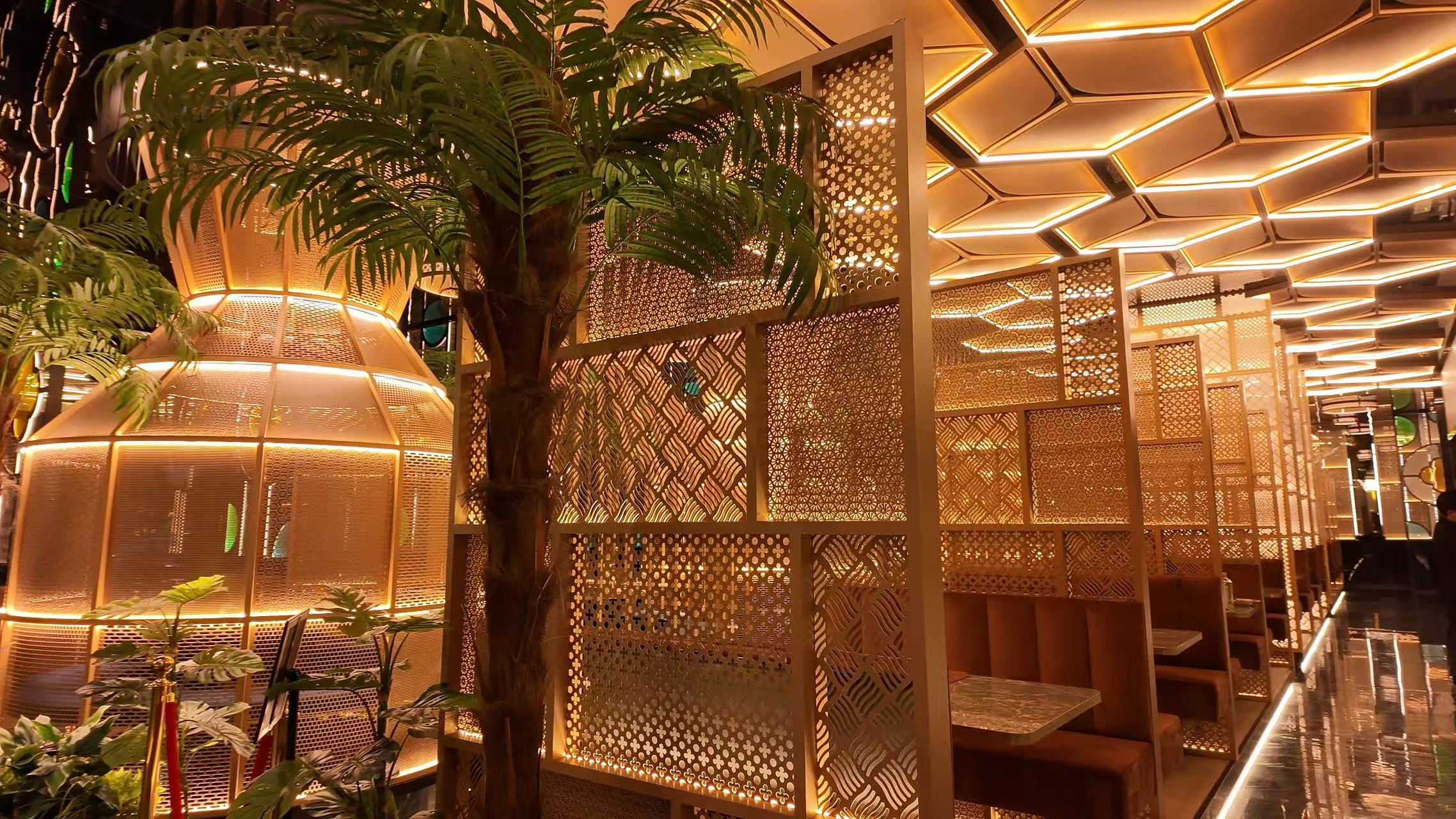超大空间,绿植悬顶、艺术灯光、波纹木雕柱与金属隔断交织出一个高级而温暖的用餐氛围,仿佛走进了热带丛林与月光剧场。空间层次、灯光氛围、材料细节,每一步我们都力求兼顾视觉震撼与经营实用,让设计不只好看,而是带来人气与生意。