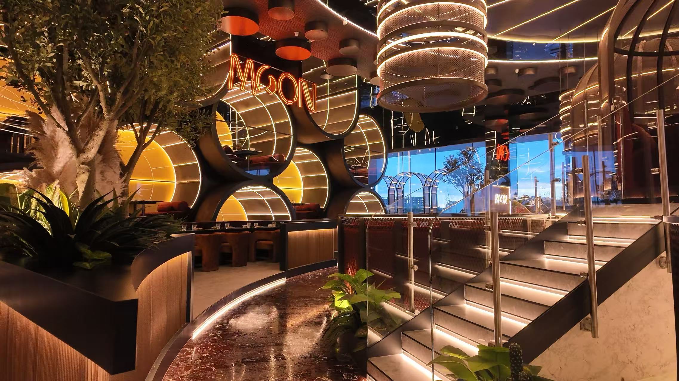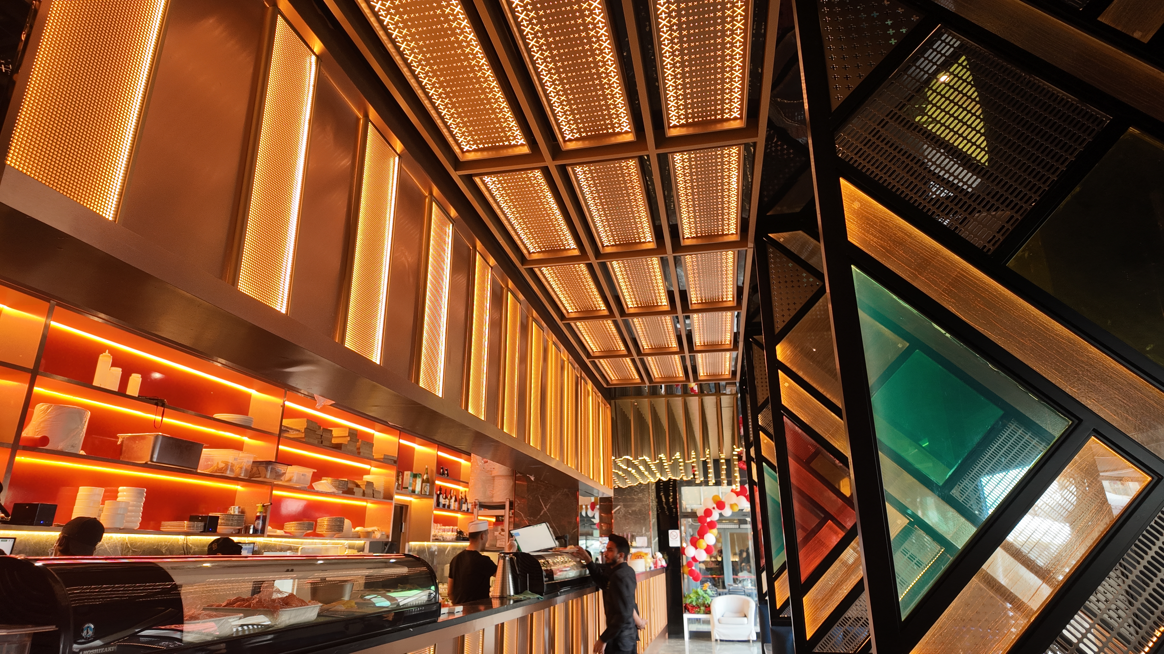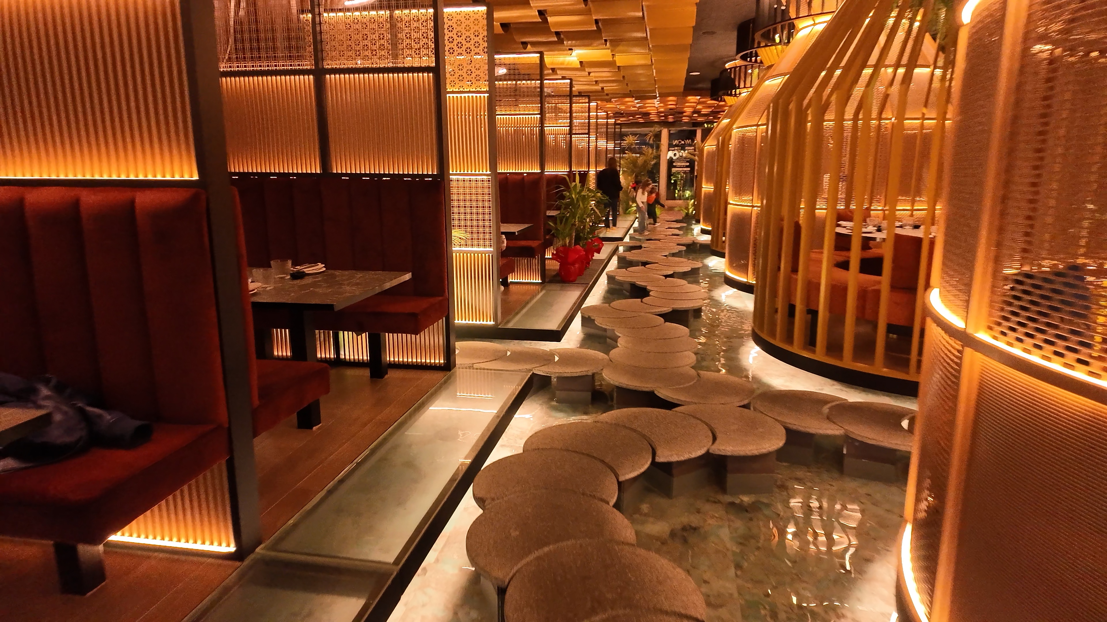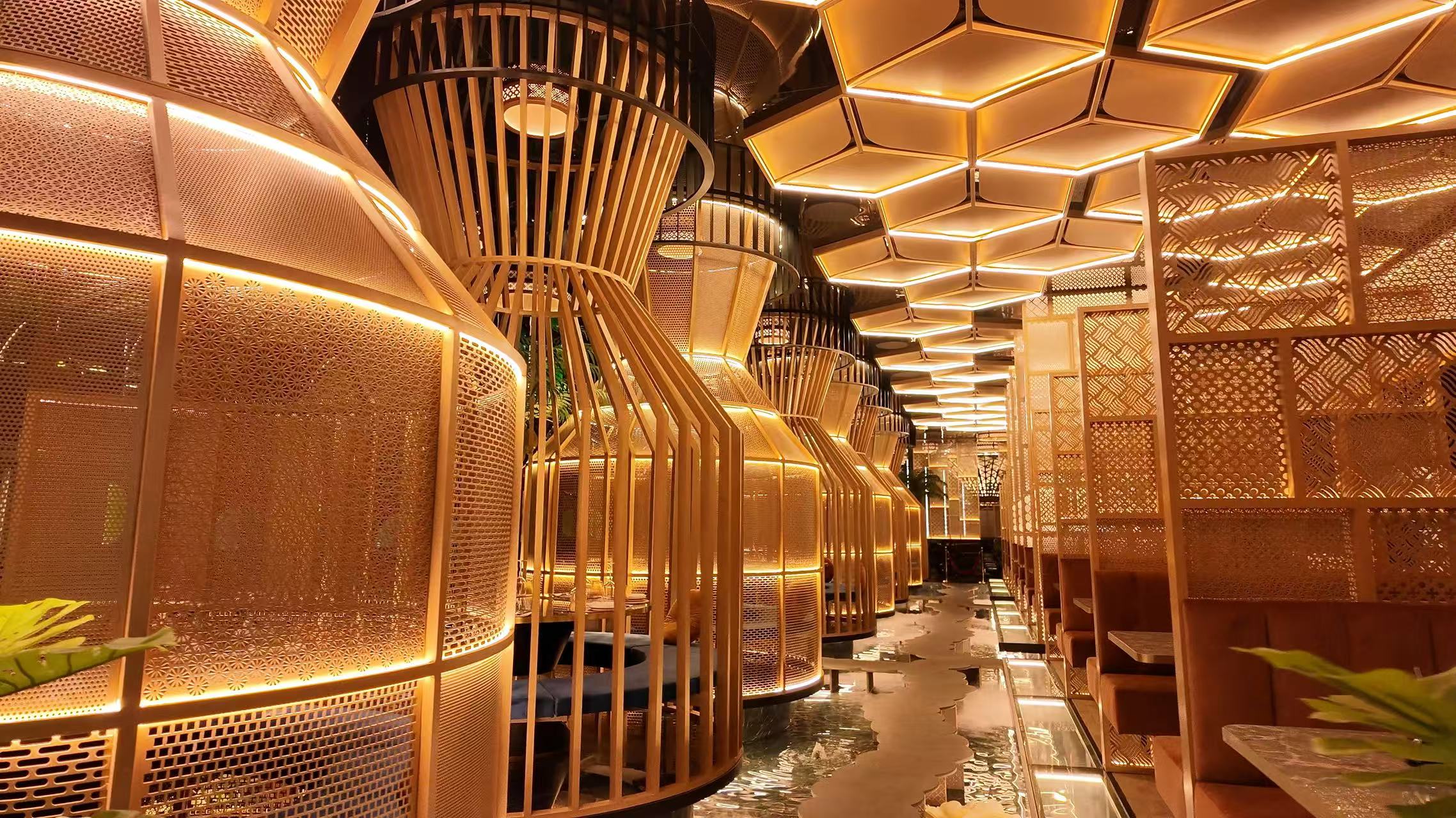 Radial lighting design with mirror reflection spaces in golden luxury style. Every detail is carefully calculated for an immersive dining experience.