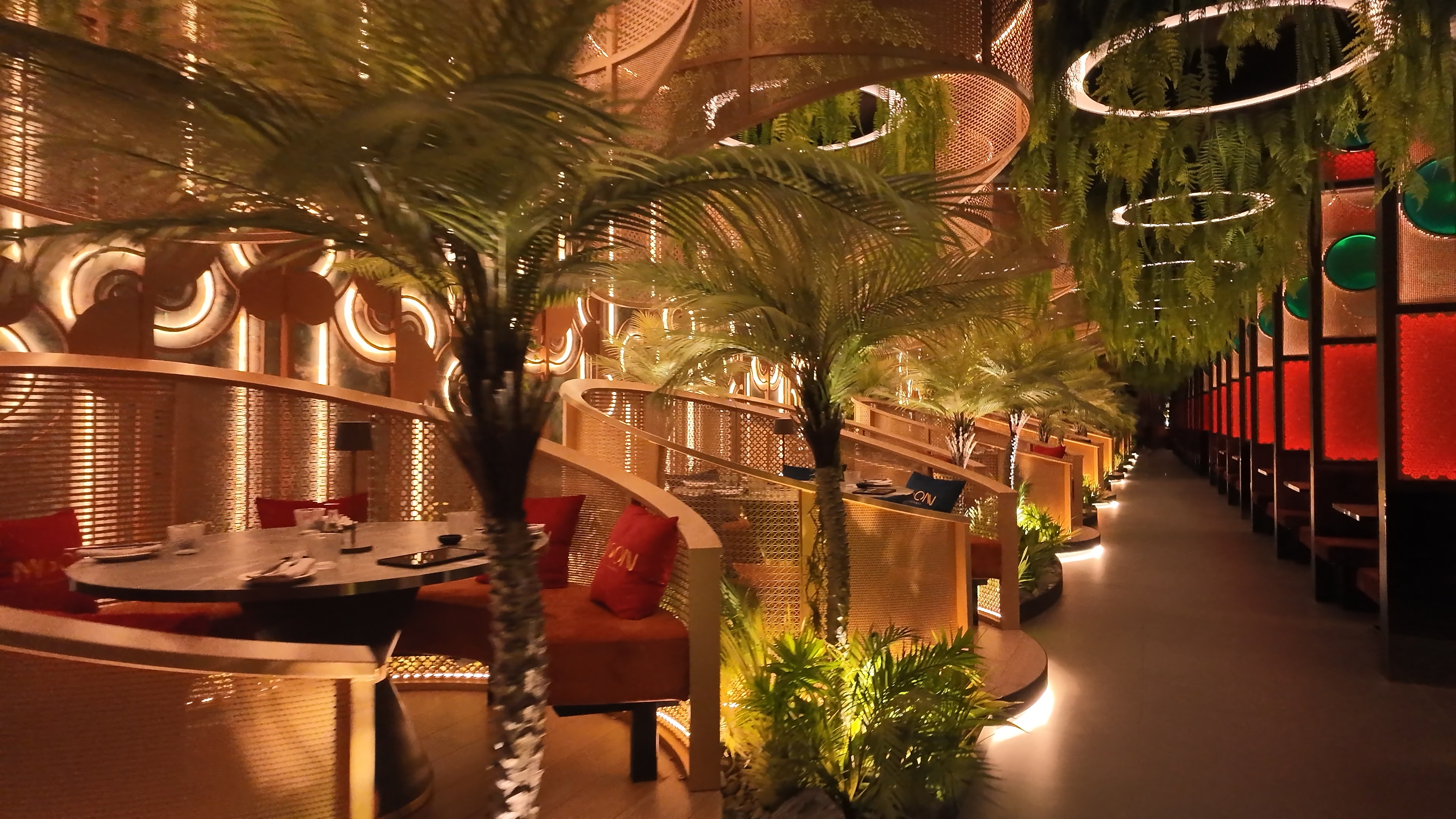 Expansive space with suspended greenery, artistic lighting, rippled wood carved columns and metal partitions creating an elevated yet warm dining atmosphere, like stepping into a tropical jungle and moonlit theater. Spatial layers, lighting ambiance, material details—every step balances visual impact with operational practicality, making design not just beautiful but driving traffic and business.