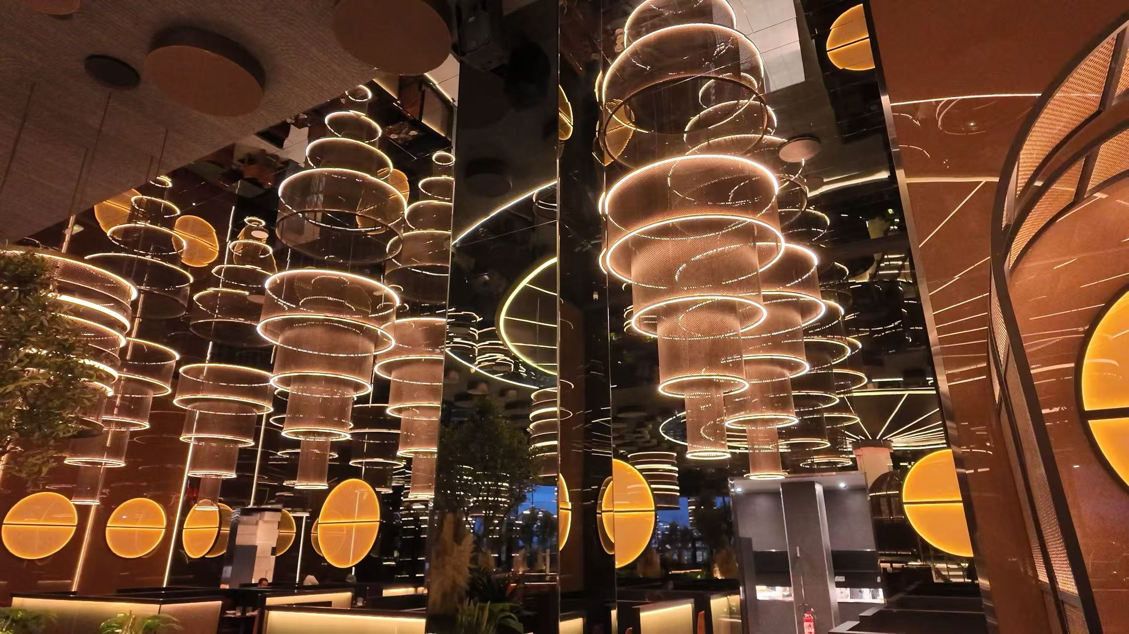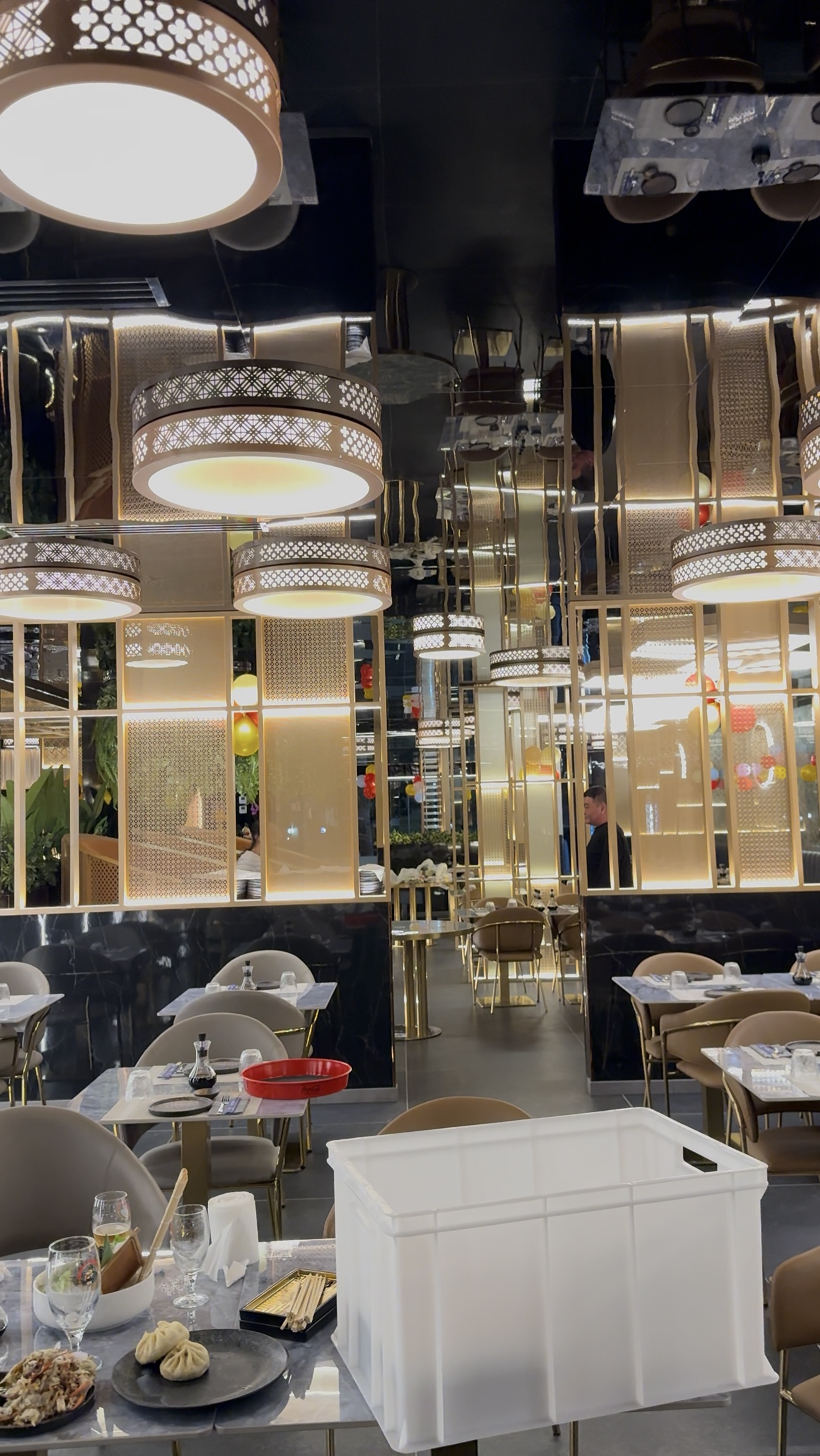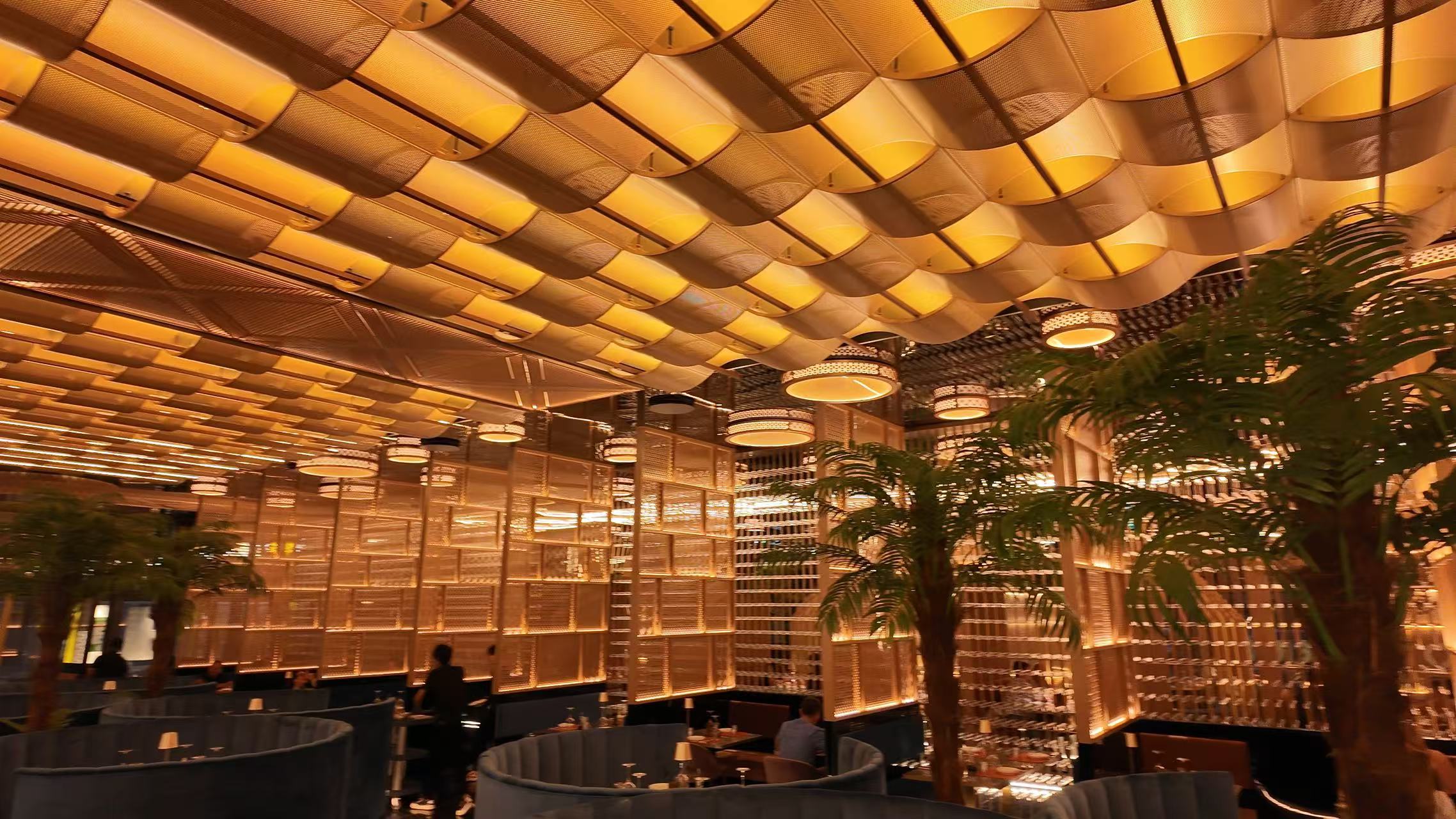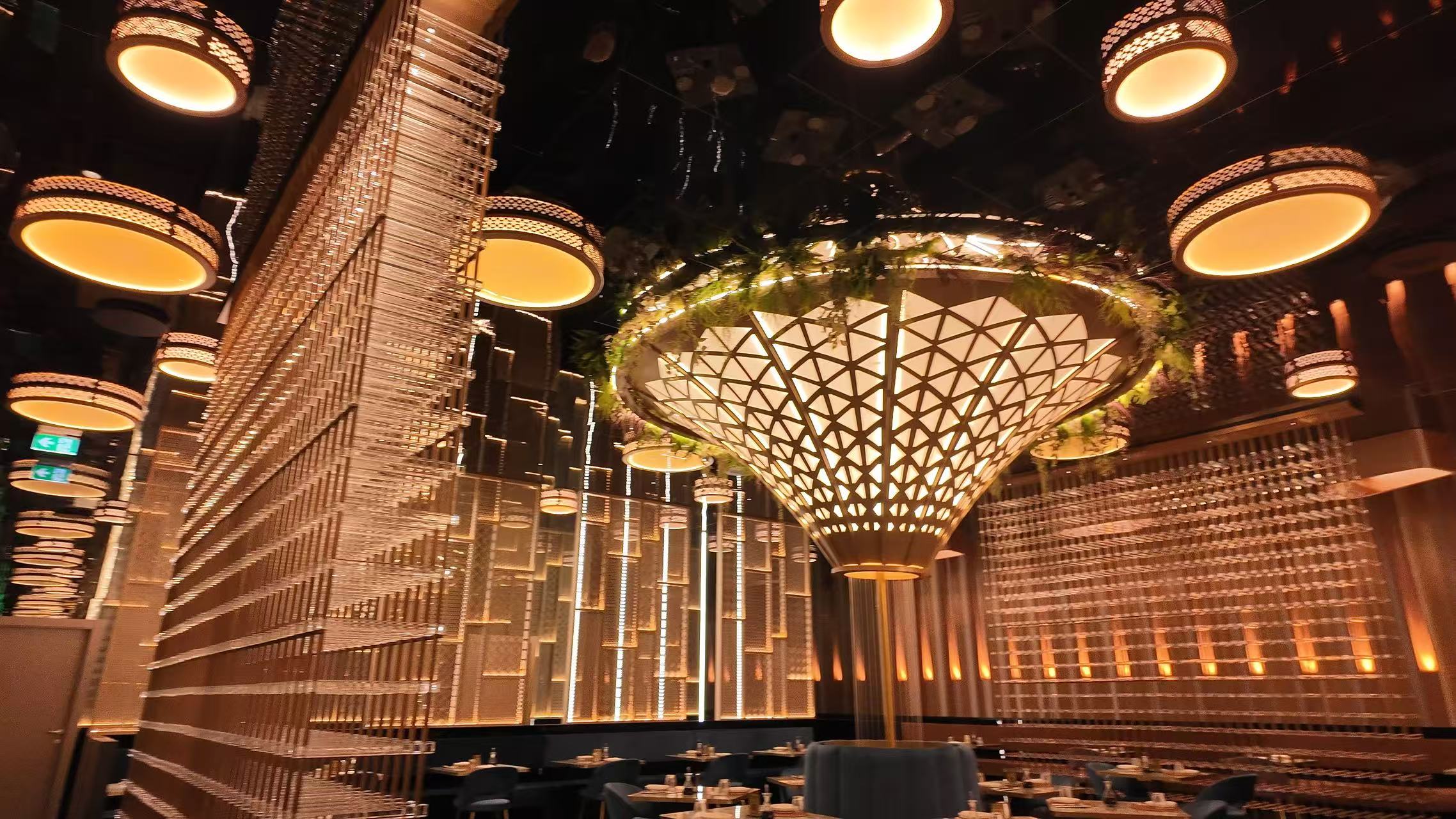 放射状灯光设计,镜面反射空间,金色奢华风格。每一处细节都经过精心计算,创造沉浸式用餐体验。