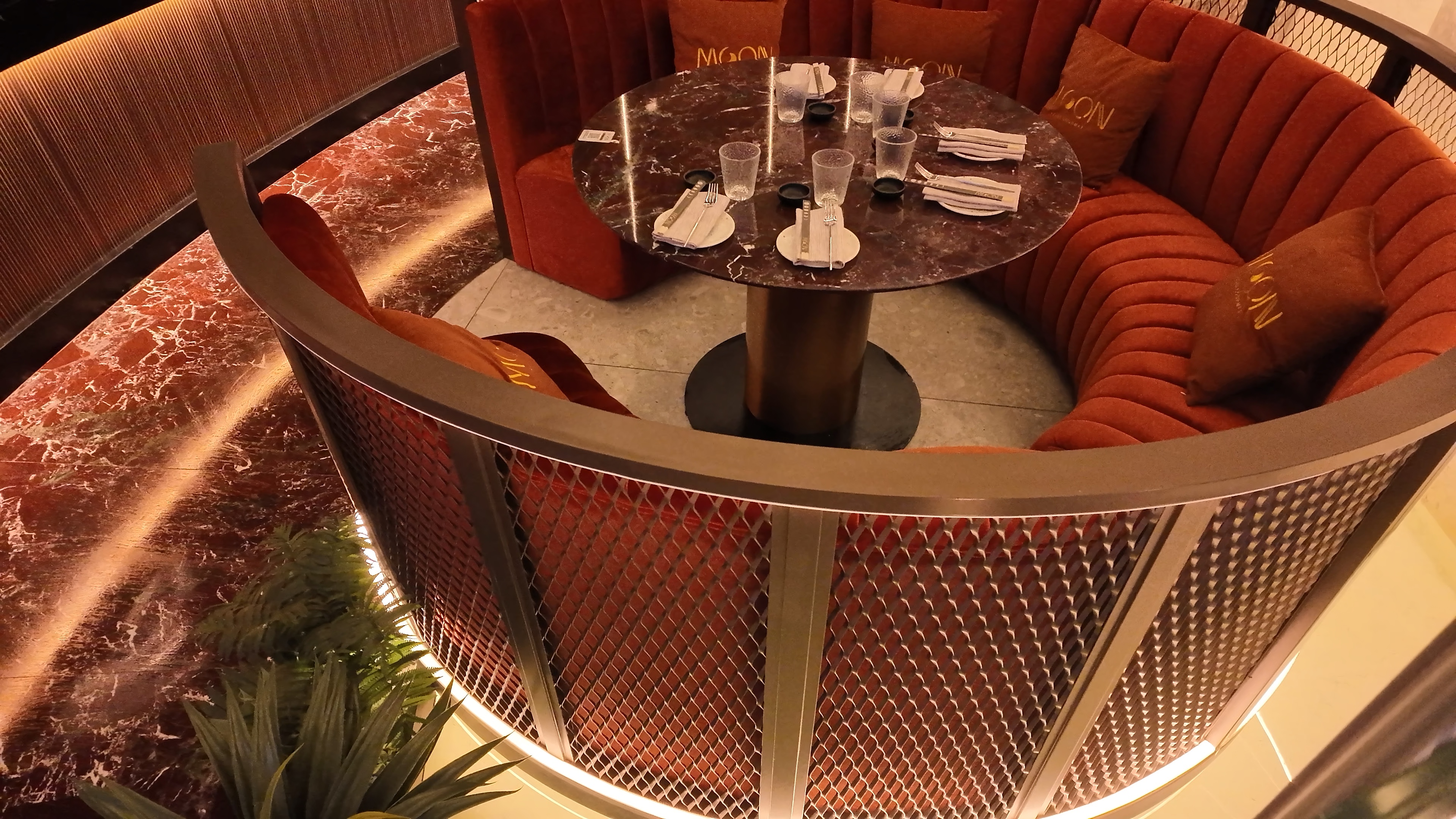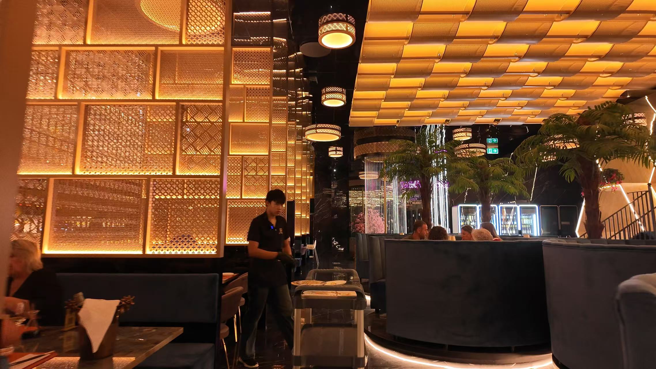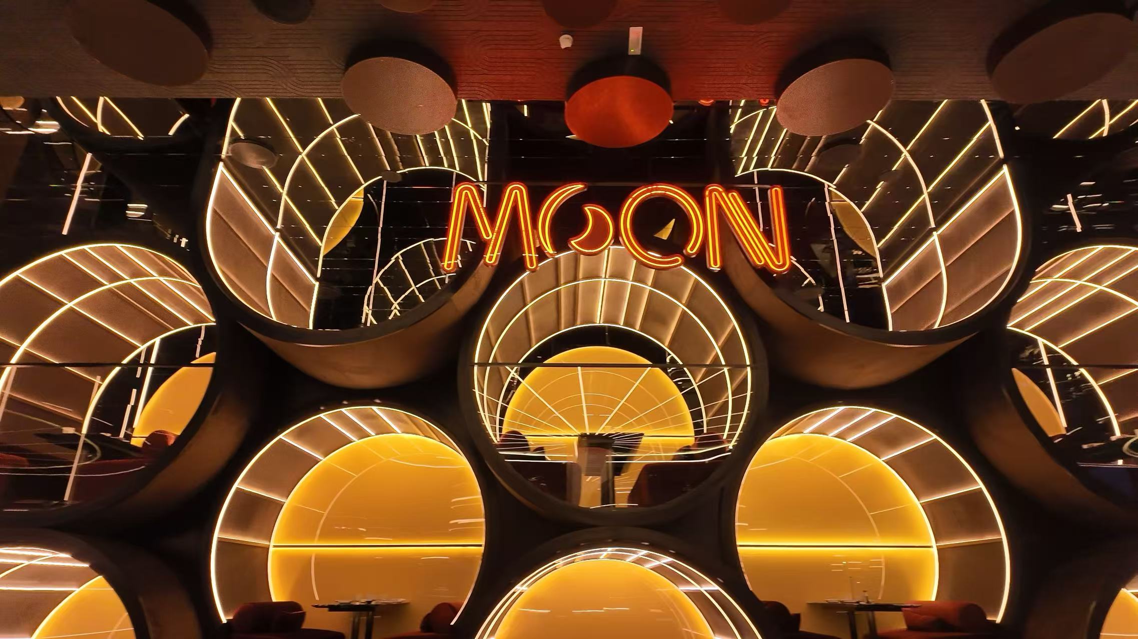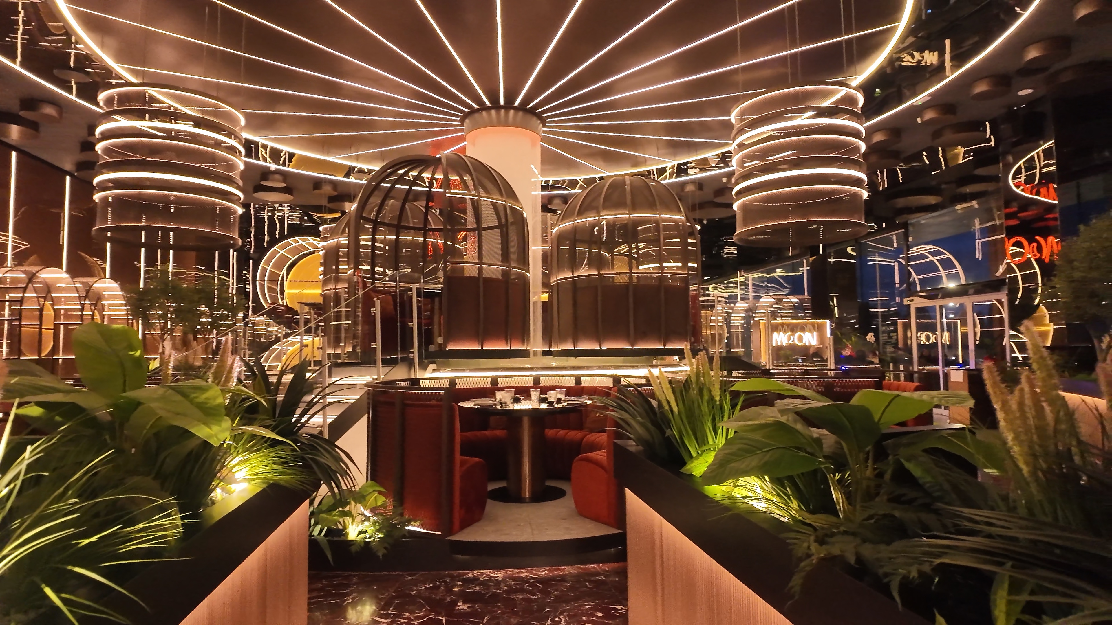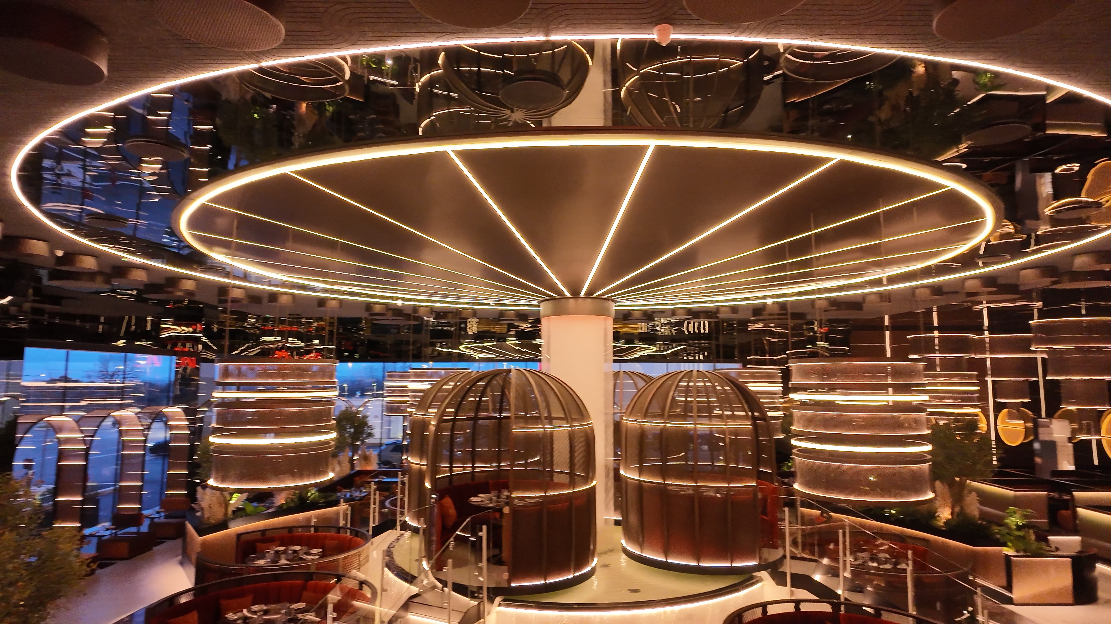 放射状灯光设计,镜面反射空间,金色奢华风格。每一处细节都经过精心计算,创造沉浸式用餐体验。