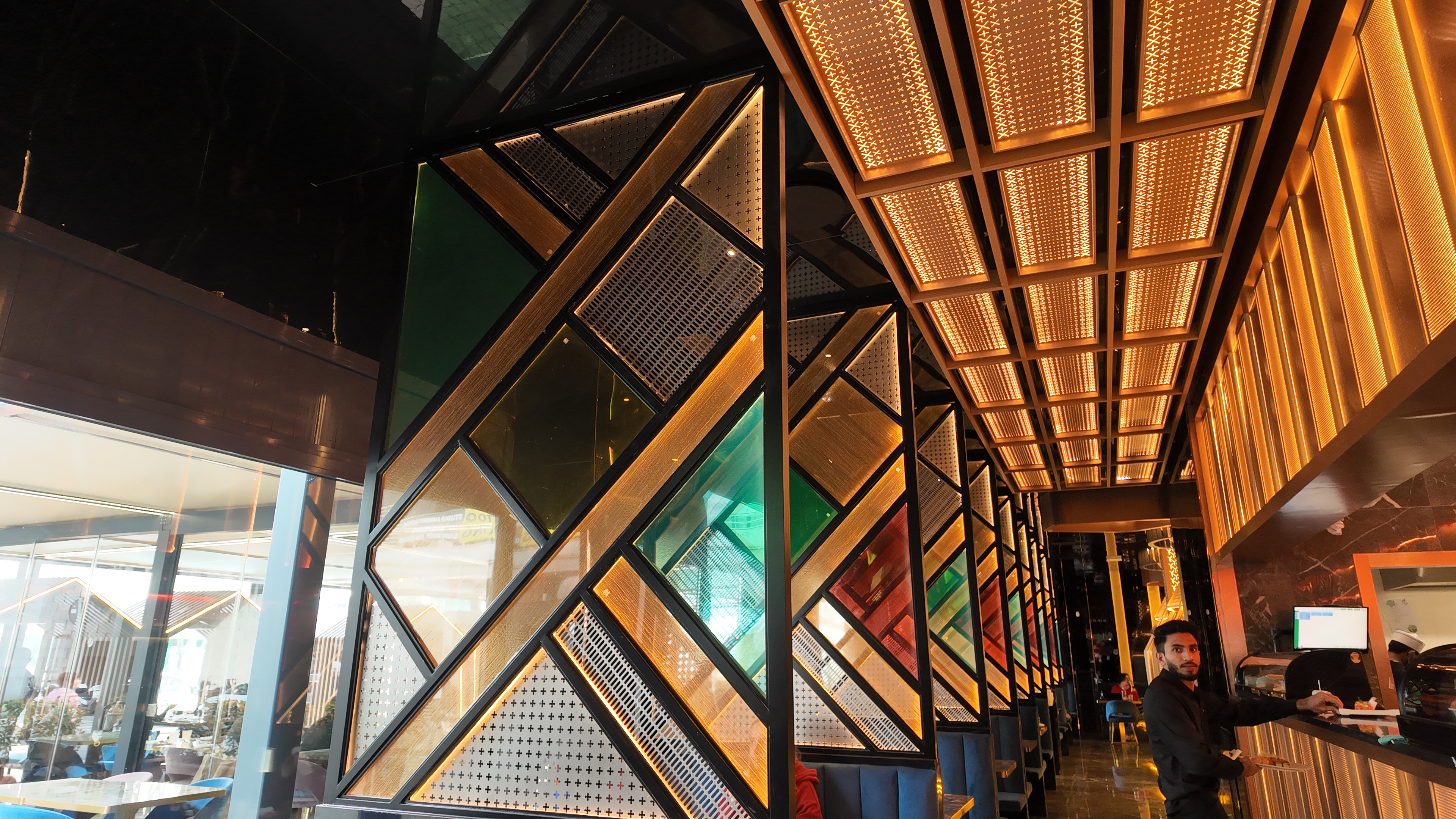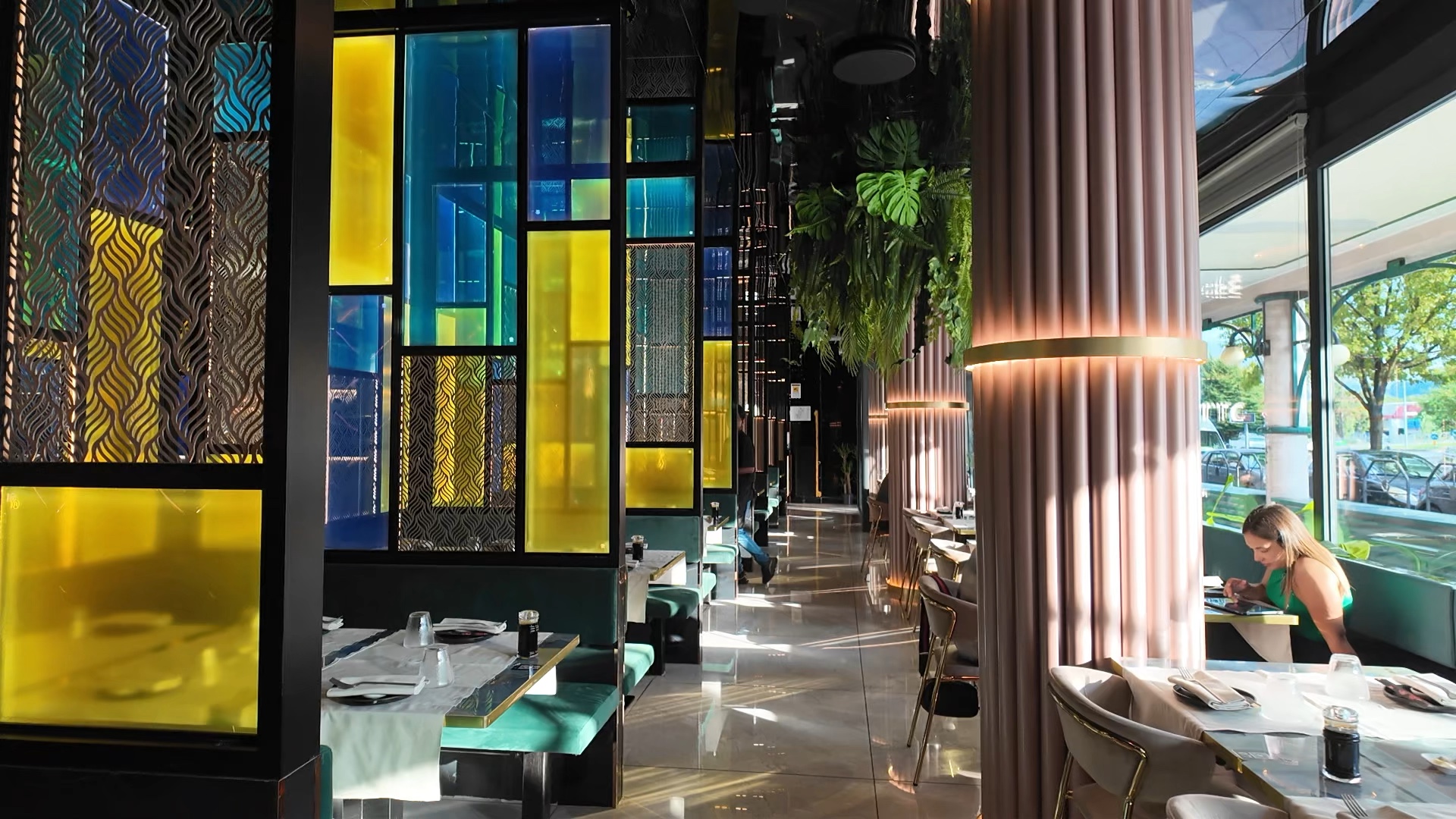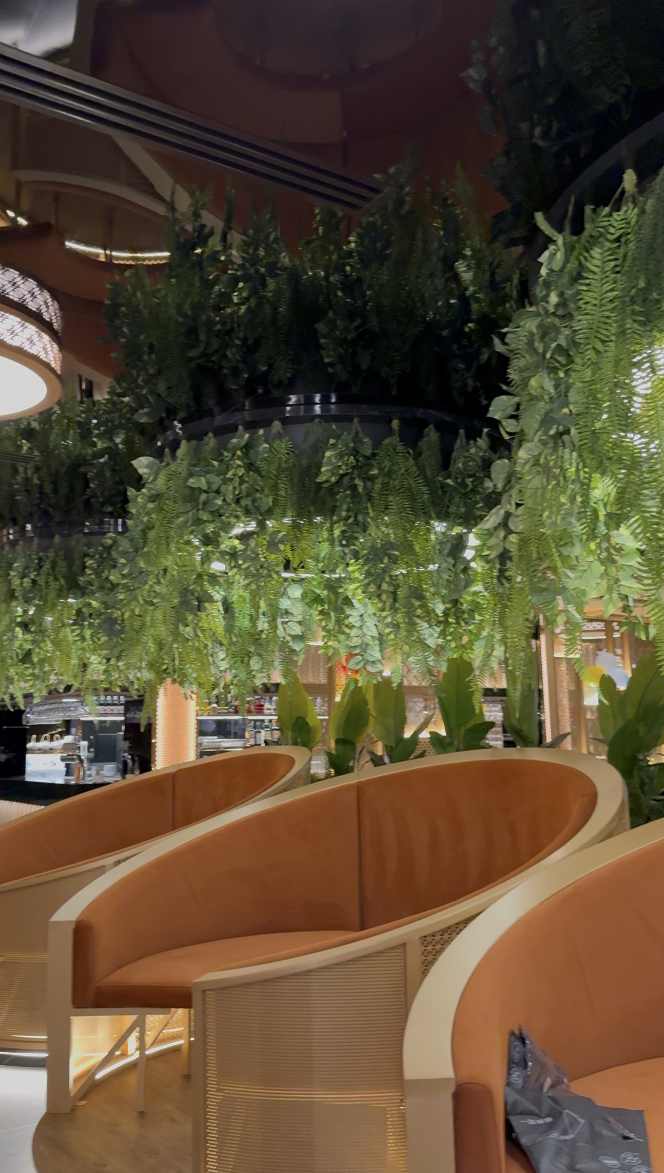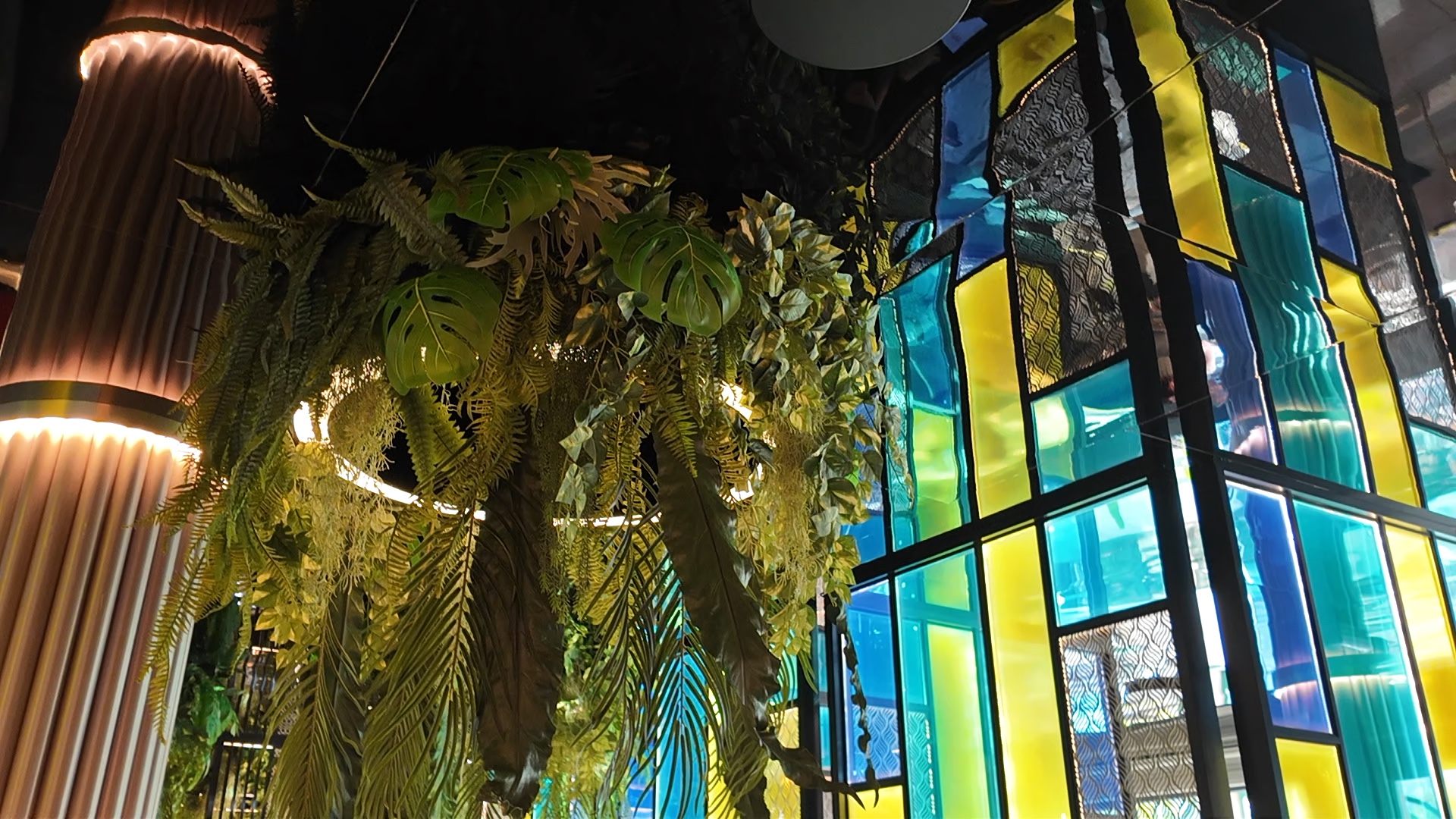 天花板植物装饰,金属柱与彩色玻璃,温暖分层照明。自然与现代完美融合,创造舒适用餐氛围。