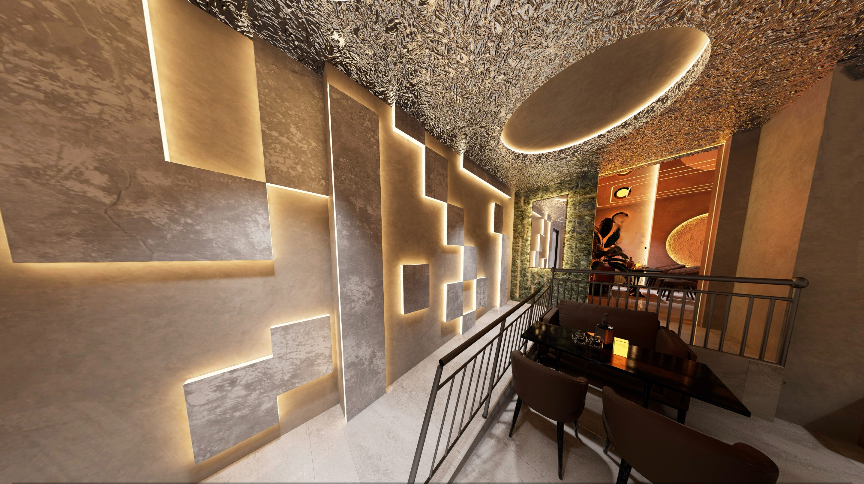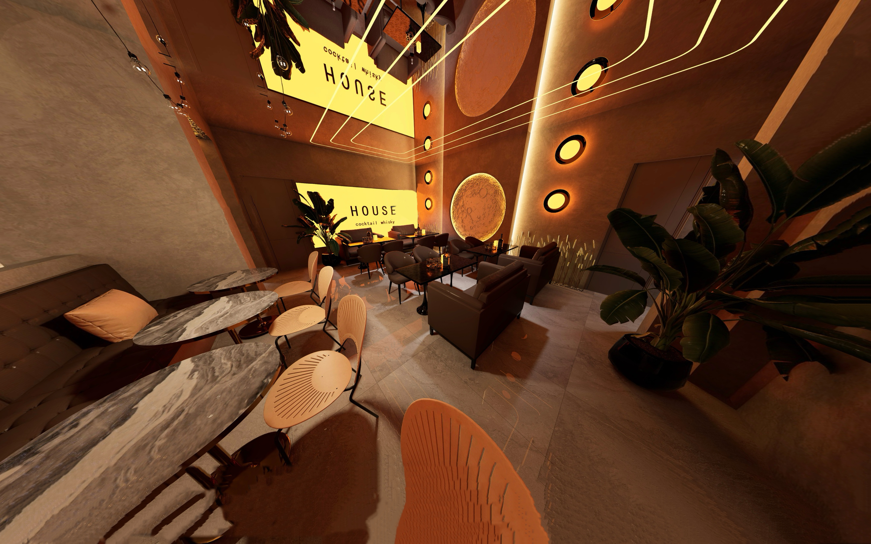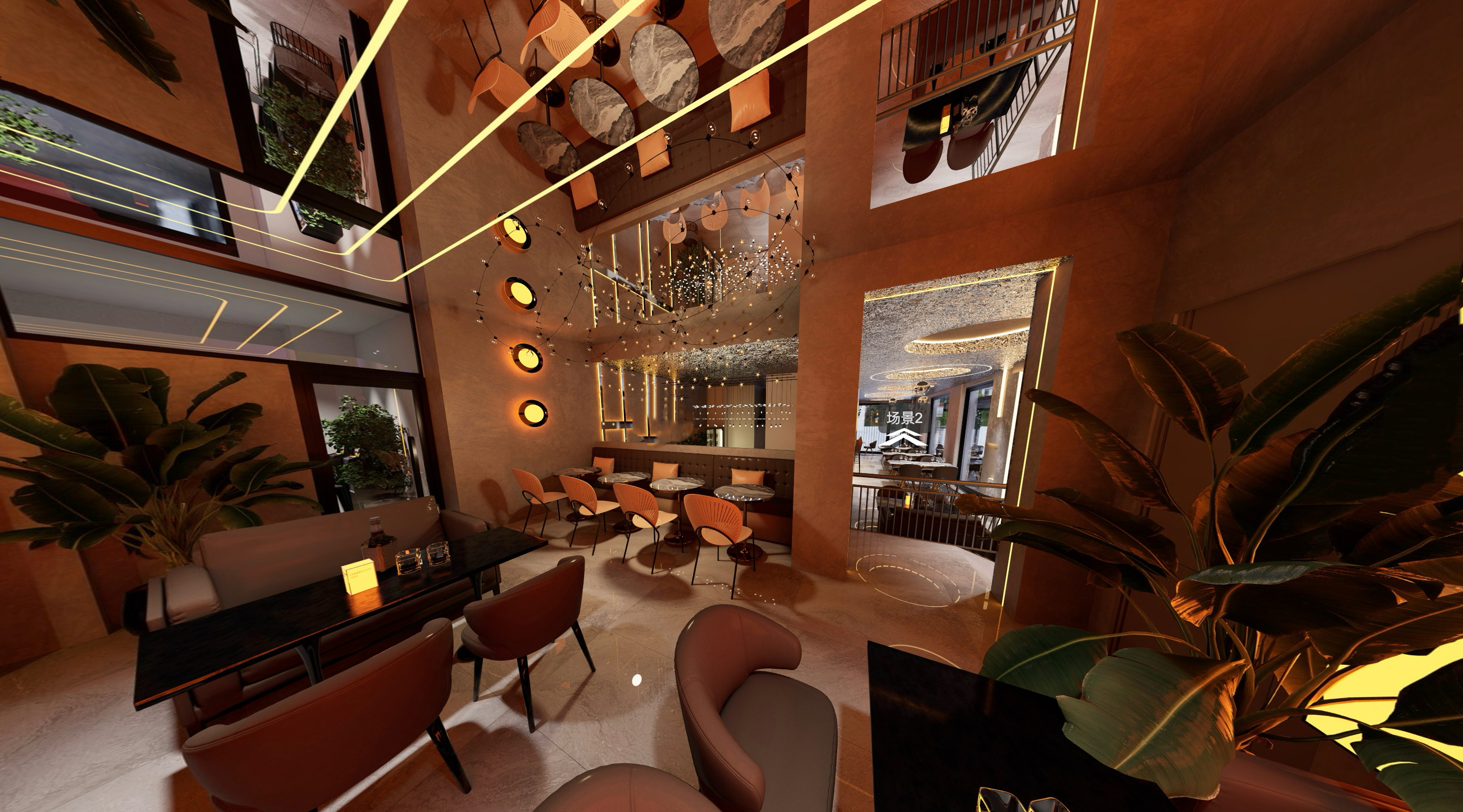 Centered around warm golden lighting, blending streamlined structures, art installations, and material textures to create an immersive and tech-forward premium social space.