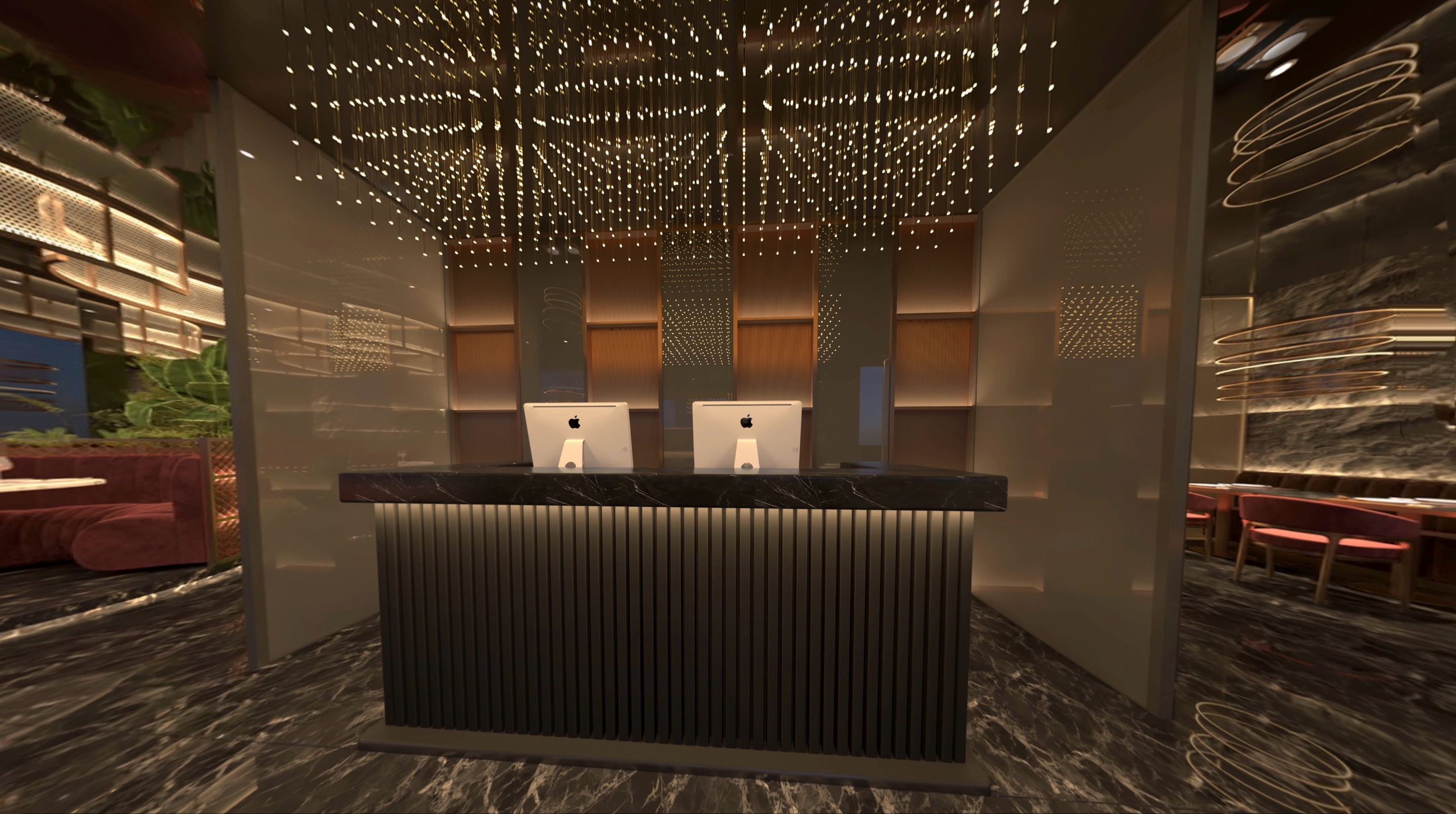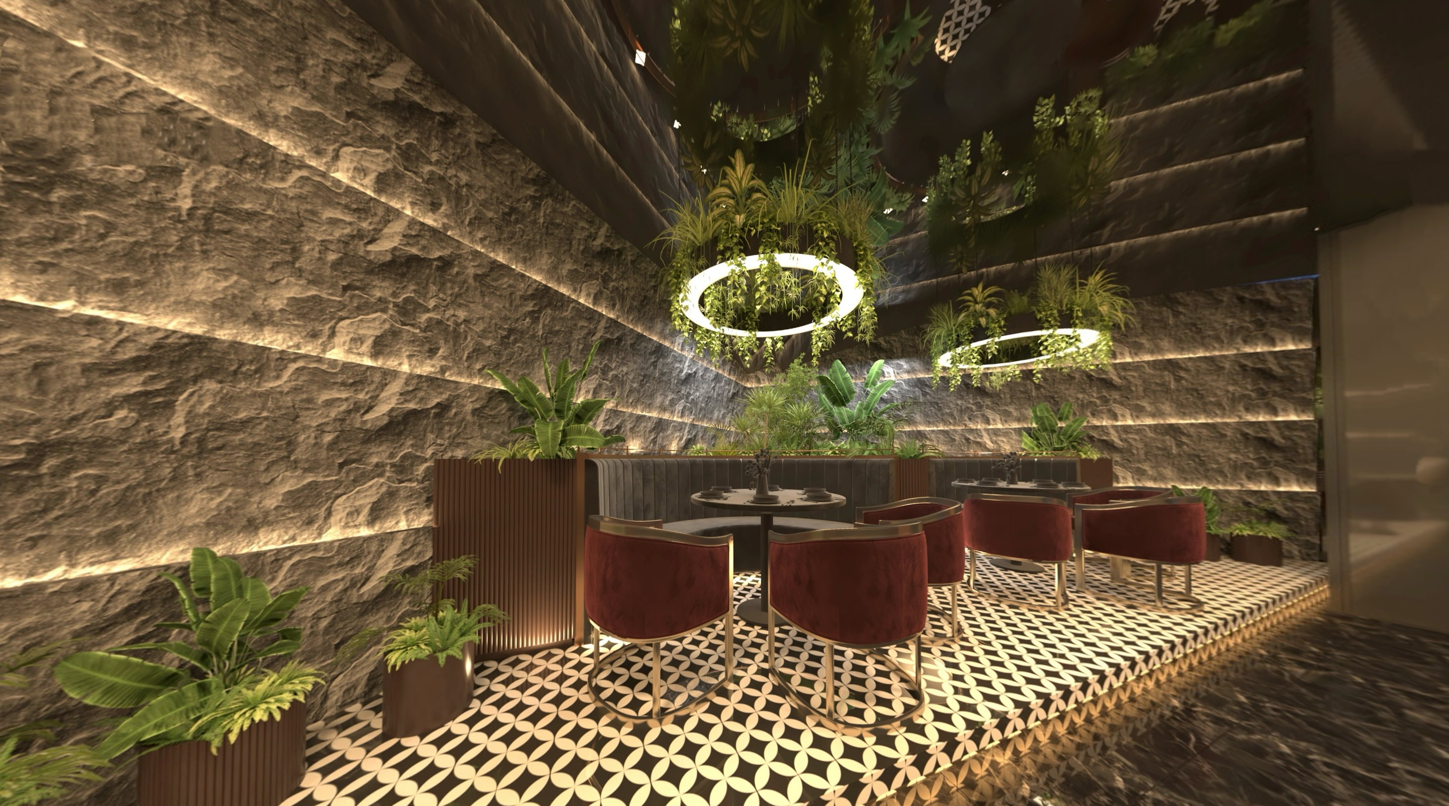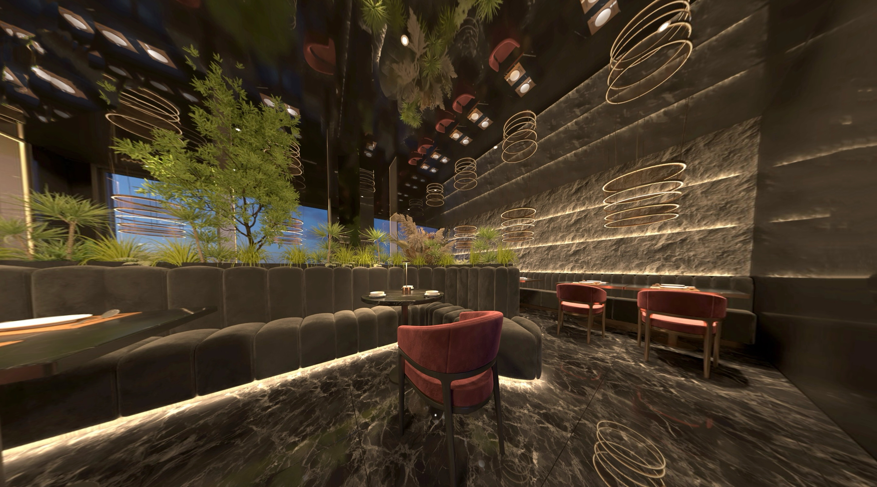 Centered around warm golden lighting, blending streamlined structures, art installations, and material textures to create an immersive and tech-forward premium social space.