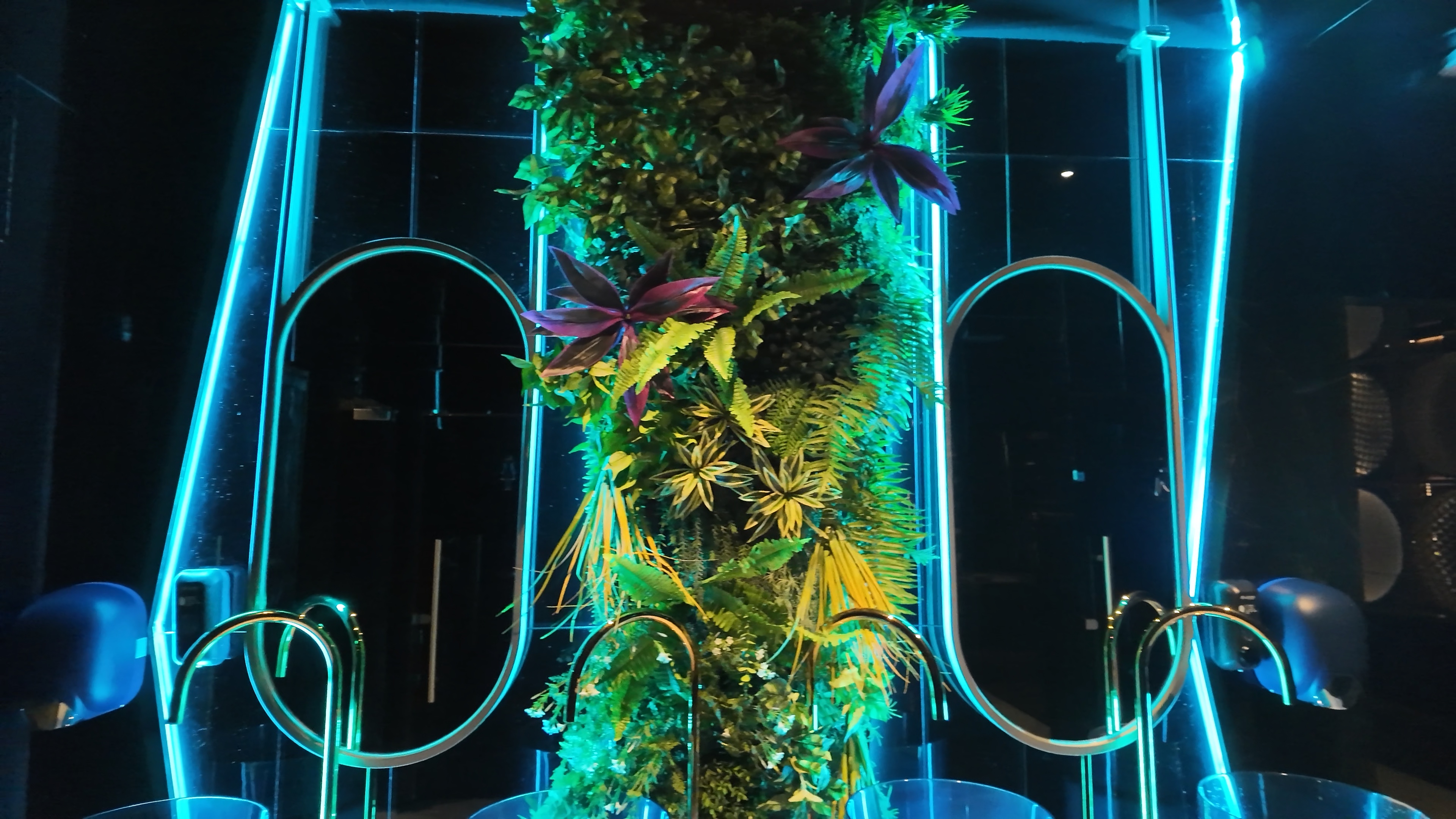 Decorazione vegetale a soffitto, colonne metalliche e vetro colorato, illuminazione stratificata calda. Fusione perfetta di natura e modernità, creando un'atmosfera confortevole.