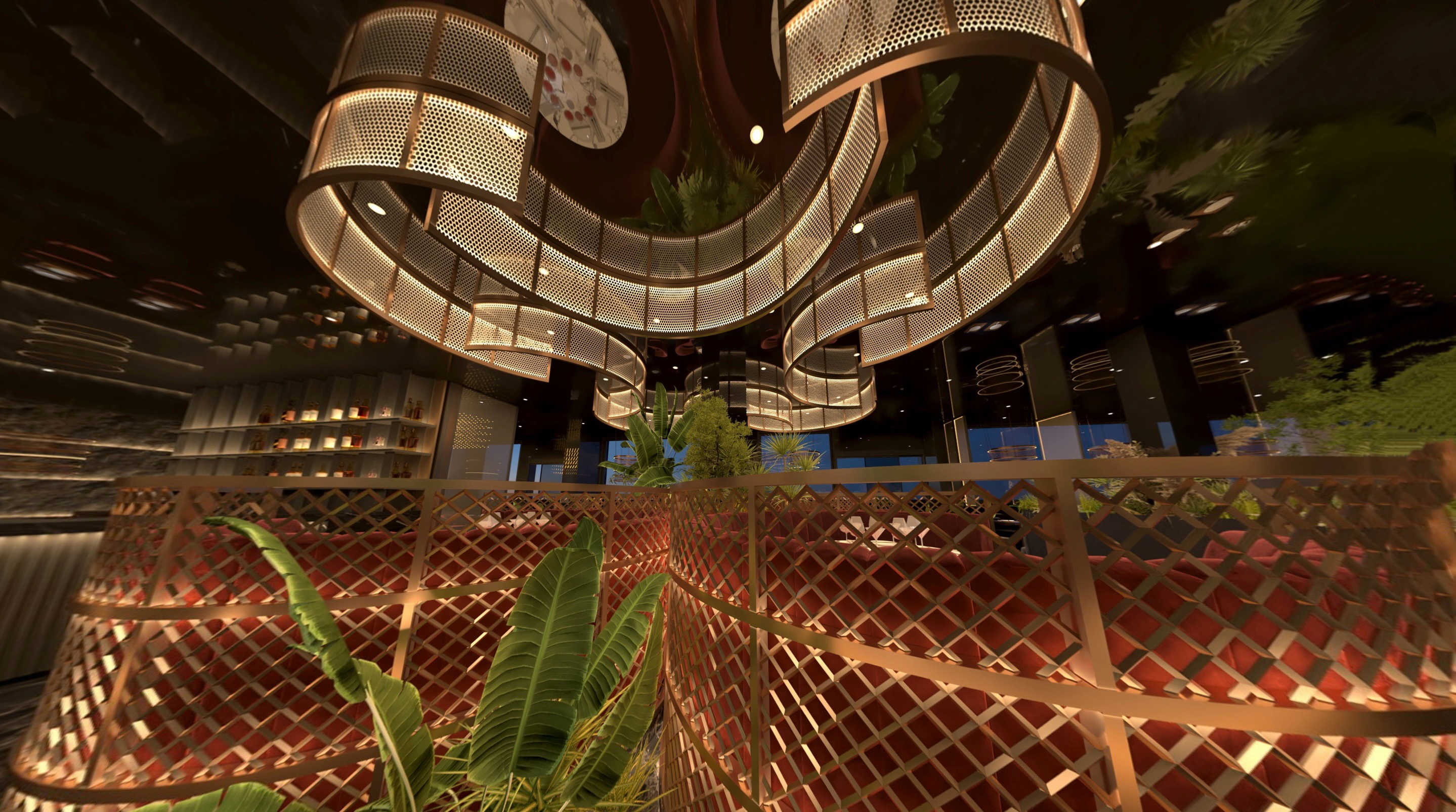 Spazio espansivo con vegetazione sospesa, illuminazione artistica, colonne in legno intagliato ondulato e partizioni metalliche che creano un'atmosfera raffinata e calda, come entrare in una giungla tropicale e un teatro al chiaro di luna. Livelli spaziali, atmosfera luminosa, dettagli materiali—ogni passo bilancia impatto visivo e praticità operativa, rendendo il design non solo bello ma trainante per affluenza e business.