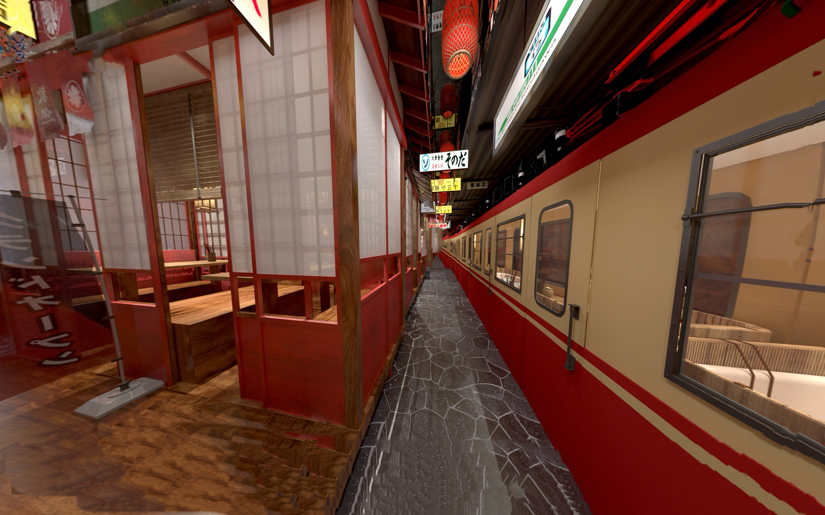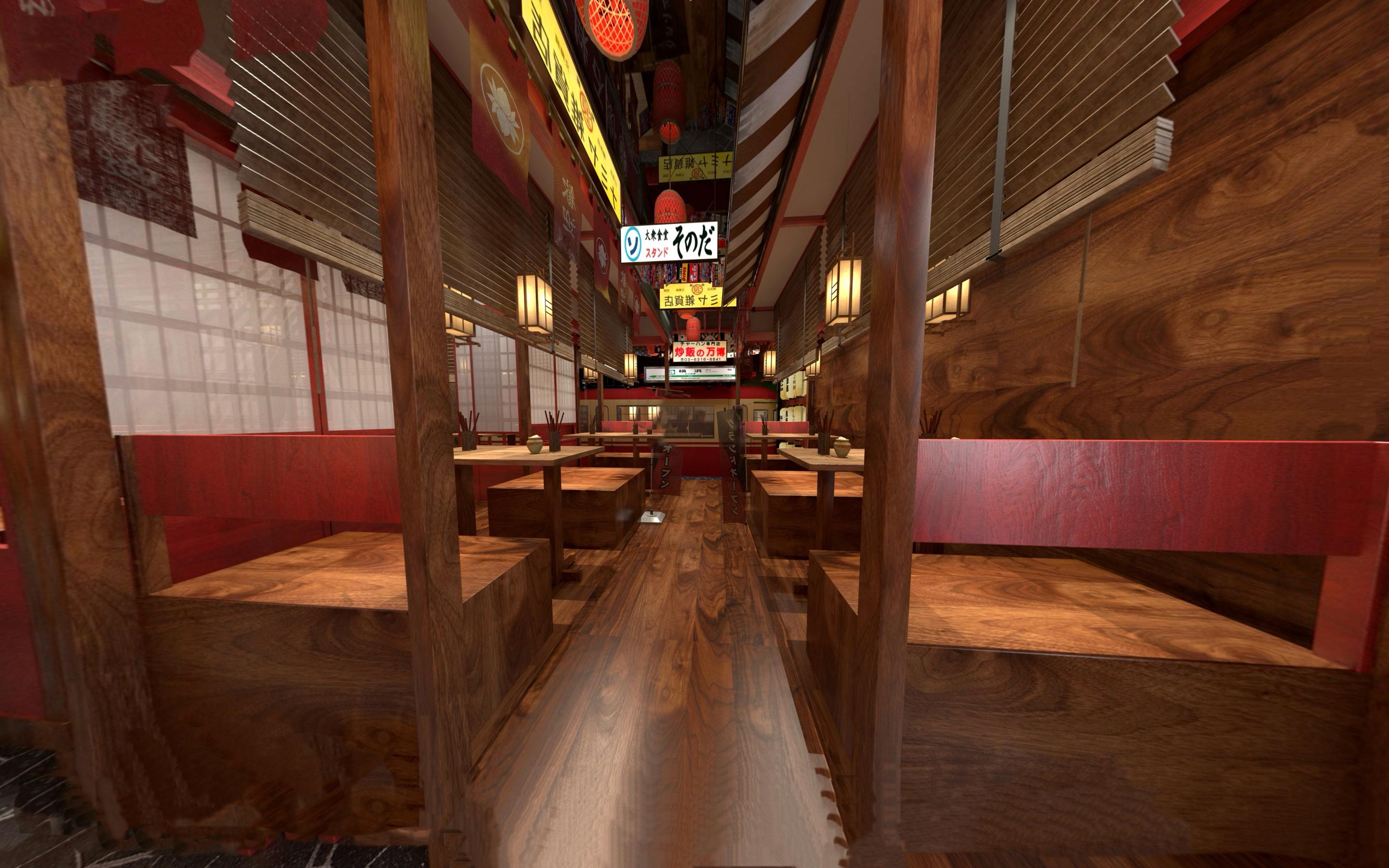 Immersive Japanese street dining space recreating Tokyo streetscapes and izakaya culture. Not just a dining space, but a Japanese street scene to explore, photograph, and experience.